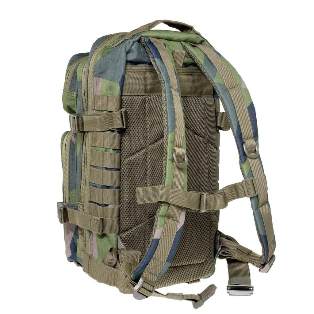 The tactical backpack 30 liters showcases the distinctive Swedish splinter M90 camouflage pattern, providing effective concealment in outdoor environments. This camouflage design helps the backpack blend seamlessly with its surroundings, offering optimal camouflage during outdoor activities or tactical missions.