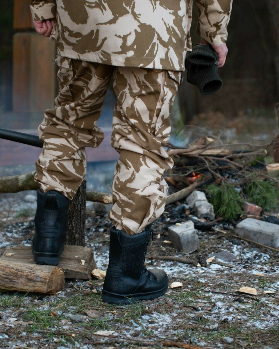 Introducing the rugged British military cargo pants! These pants are built tough for challenging situations. With durable desert camouflage fabric, they're ready for any adventure. You'll find plenty of storage with cargo and slash pockets, perfect for keeping your essentials safe on the move. Plus, these pockets have secure closures to ensure nothing falls out.