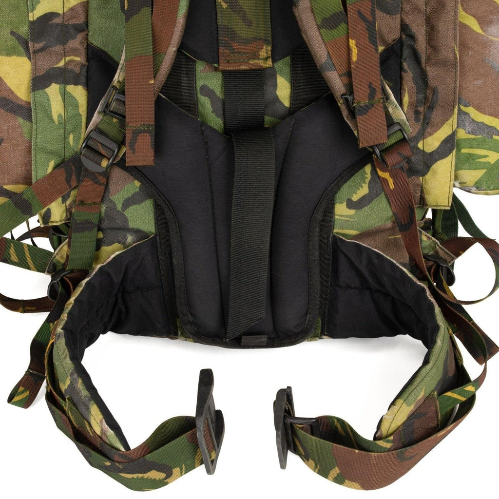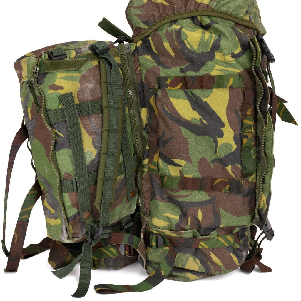 Original Dutch army DPM camouflage pattern combat rucksack made by ARWY. This robust backpack features a main compartment with a generous 60-liter capacity and detachable side pockets on both sides, each adding an additional 10 liters of capacity (totaling 20 liters). The detached side pouches can be zipped together and conveniently worn as a small day pack. An aluminum frame is integrated into the back panel to provide sturdy support and optimal weight distribution for heavy loads, making this rucksack ideal for extended missions, tactical use, and outdoor adventures.