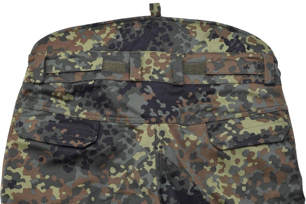 - These camouflage pants, crafted from durable rip-stop flecktarn camo fabric, offer exceptional performance. The adjustable high waist ensures a comfortable fit, while zipped inner legs and suspender loops add convenience.