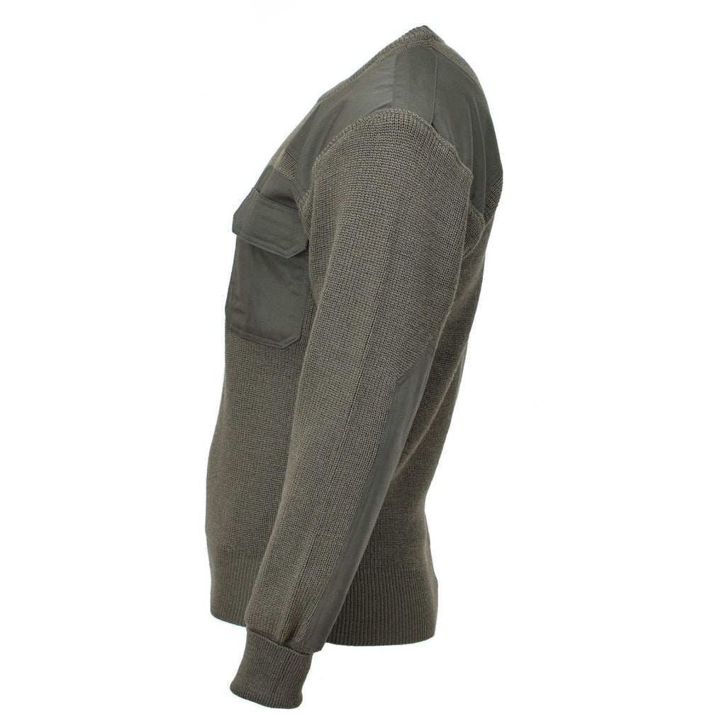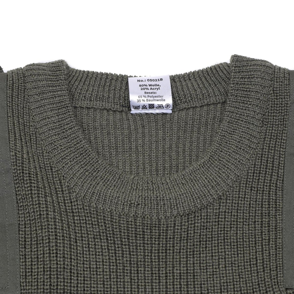 The MFH Brand German army commando pullover is a reinforced rib knit sweater in an OD green color, designed for military use. It is made by the German company MFH and is constructed from high-quality materials that provide durability and comfort. The sweater features reinforced rib-knit patches on the shoulders and elbows for added strength and durability. It has a round neck and long sleeves, making it suitable for use in cold weather. The sweater is designed with military style and is ideal for outdoor activities, such as hiking or camping. It is a popular choice for those who want a functional and durable piece of clothing.