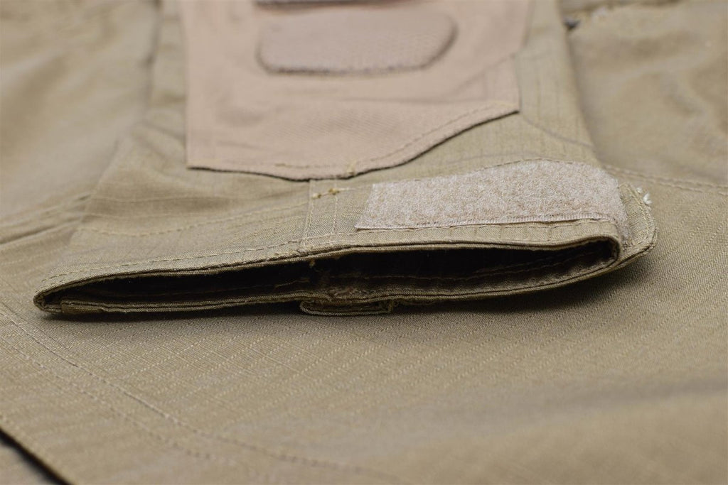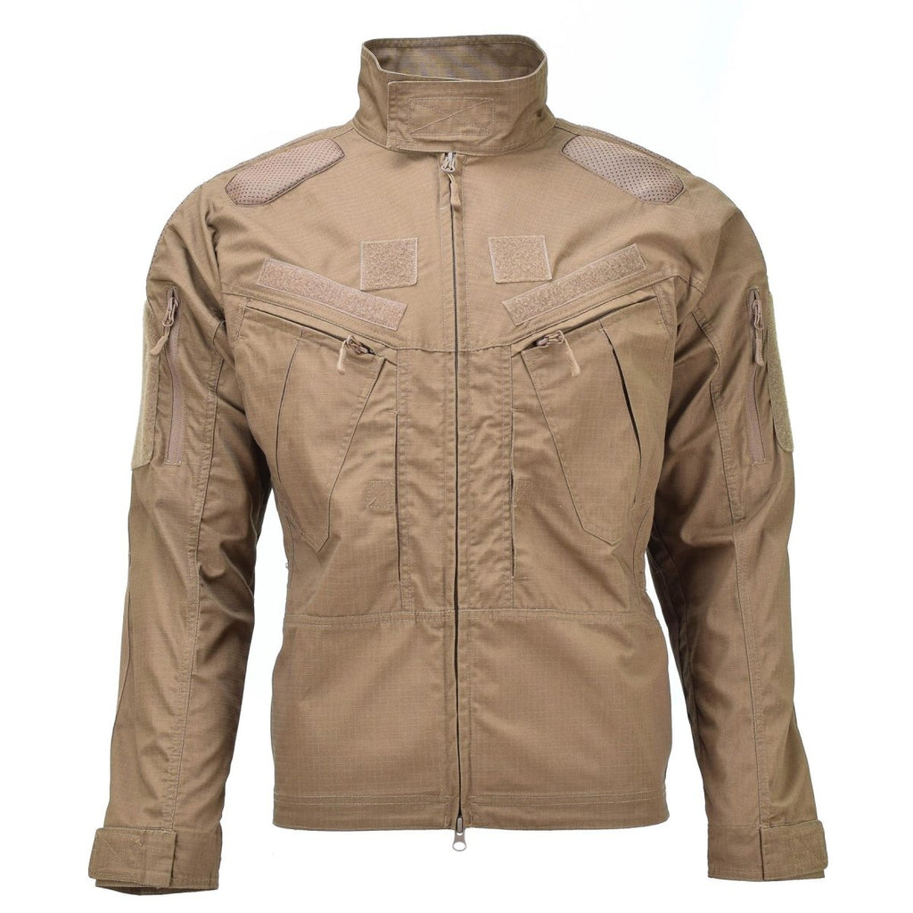 - Additional features include shoulder patches for enhanced durability and gear attachment points, dual front zippers for ventilation and access, and reinforced stitching throughout the jacket for longevity and resilience in the field.