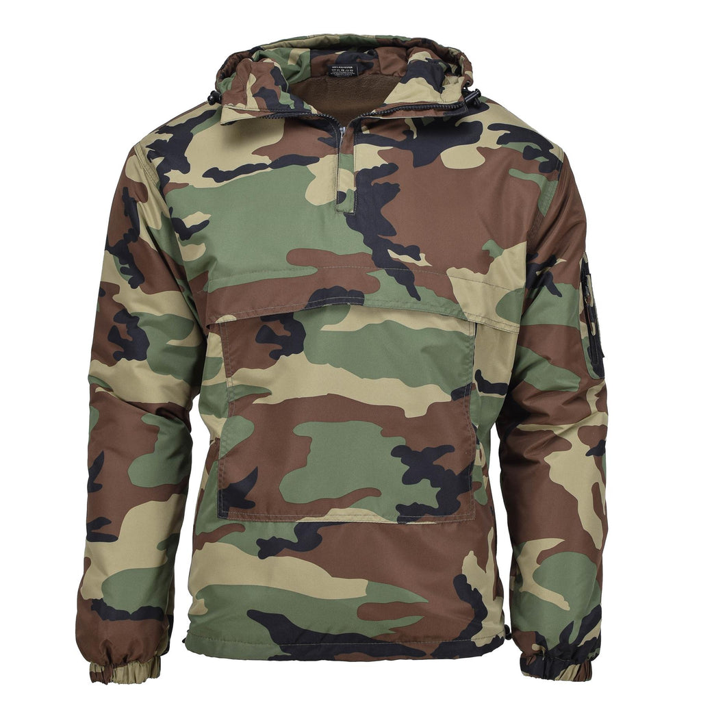 The MIL-TEC Military combat anorak woodland camo jacket is a winter jacket designed for use in woodland environments. It features a windproof outer shell and a hood with a lining to provide warmth and protection in cold weather conditions. It's designed for military use and can be used in various outdoor activities as well.