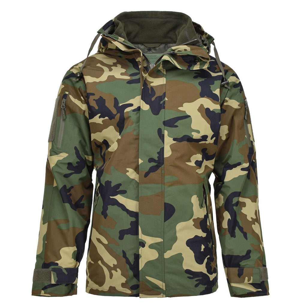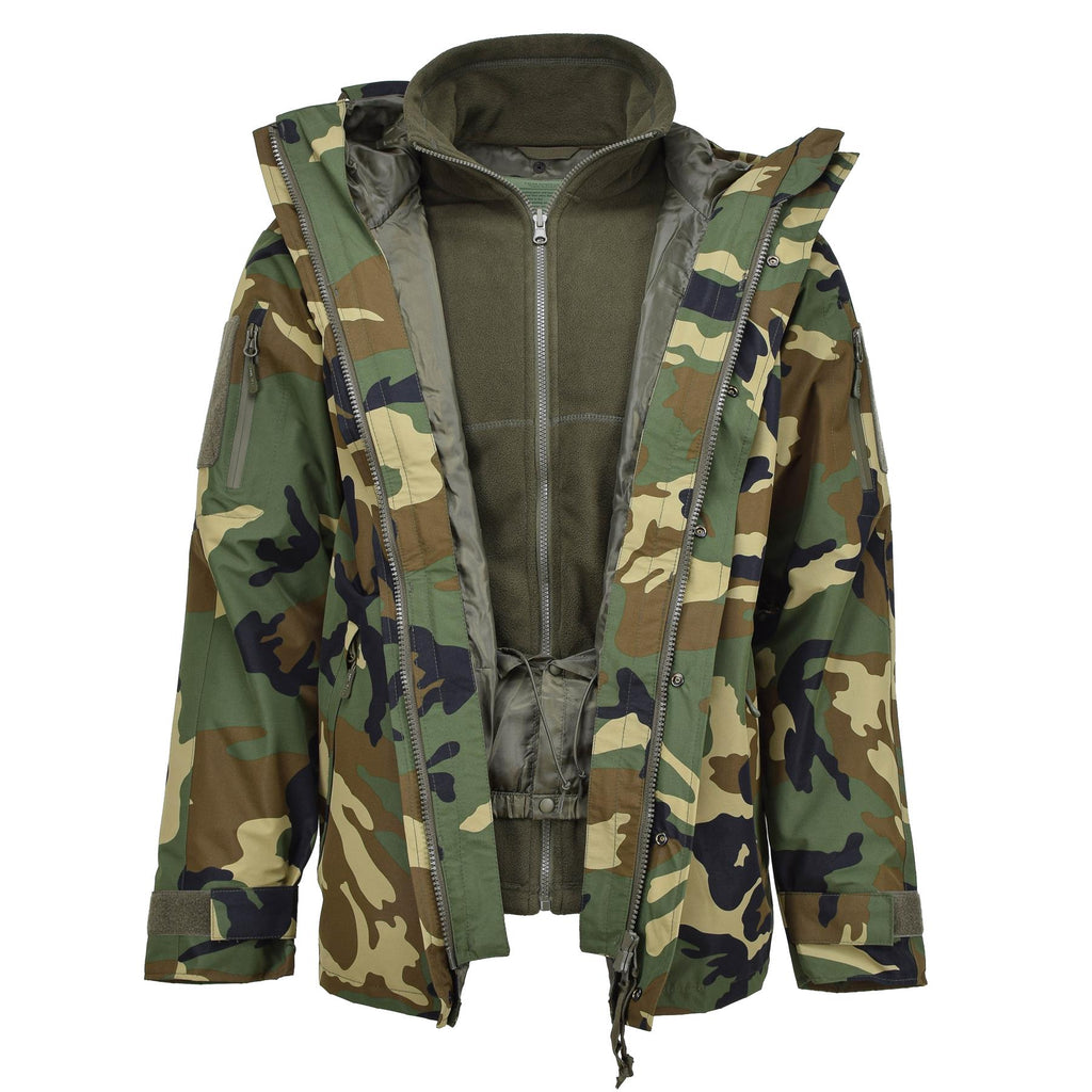 - Its military style woodland camouflage pattern provides a rugged, functional look, perfect for outdoor activities. The jacket includes a removable fleece liner, allowing it to adapt to various weather conditions. Whether you face heavy rain or chill, this jacket keeps you warm and dry.