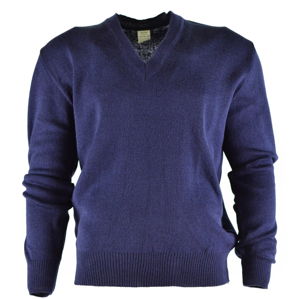 The military surplus wool sweater is a true example of quality and durability. This original Czech Army blue wool V-neck sweater combines comfort with functionality, offering a reliable option for colder weather.