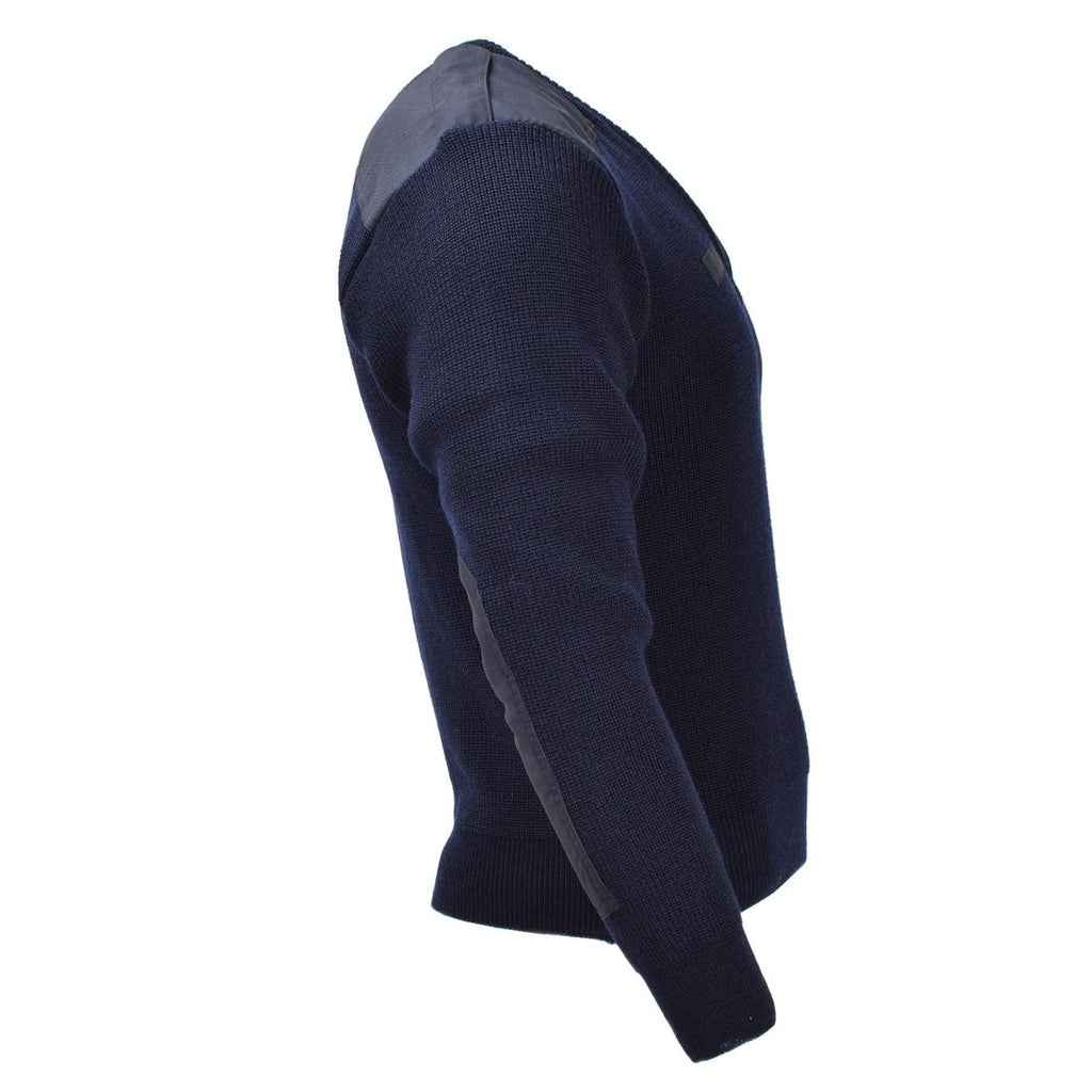 - The military blue sweater features a classic pullover design, providing both comfort and practicality. The ribbed V-neck, cuffs, and waistline ensure a snug fit, adding a polished touch to the sweater. Reinforced shoulders and elbows increase durability, ensuring the sweater holds up to daily wear.
