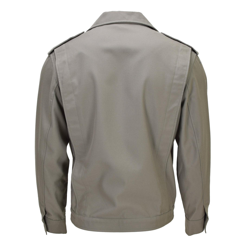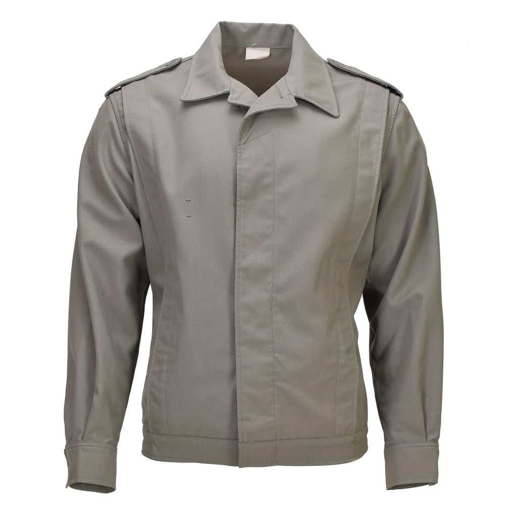 The classic military jacket offers a timeless design that combines style and practicality. This original French military jacket comes in an elegant grey color, making it suitable for various occasions. It features pleats and an elasticated hemline, ensuring comfort while maintaining a tailored, sleek look.