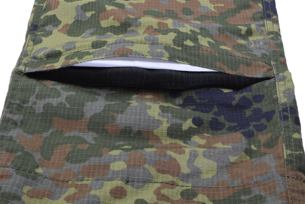 - Crafted from high-quality ripstop material, these flecktarn cargo pants resist tearing and stand up to heavy use. The reinforced seat and knees add extra durability, making them ideal for crawling, kneeling, or intense activity. The flecktarn camouflage pattern blends seamlessly with natural surroundings, providing effective concealment in wooded areas.